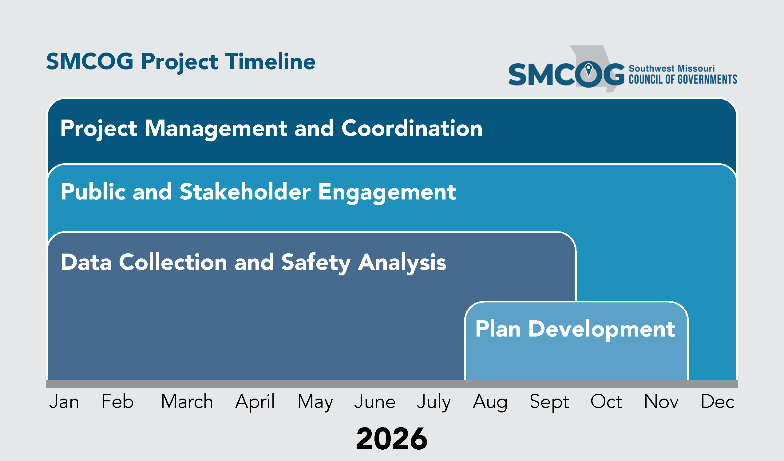 The Southwest Missouri Council of Governments (SMCOG) represents the following 10 counties in Southwest Missouri: Barry, Christian, Dade, Dallas, Greene, Lawrence, Polk, Stone, Taney, and Webster Counties. The Ozarks Transportation Organization (OTO) is located within this area but is not included in the project. This plan will identify transportation safety improvements for each county and its communities.